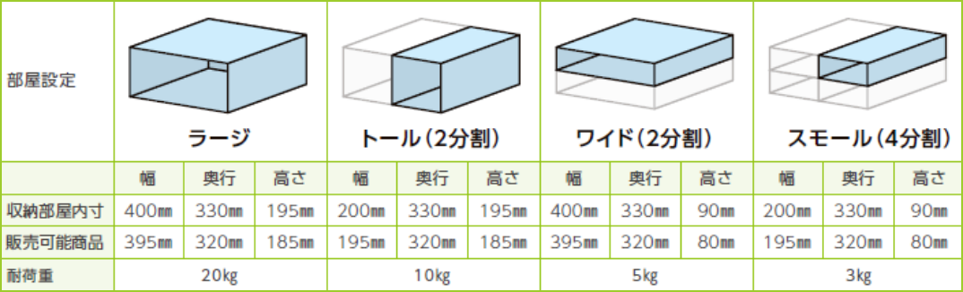 商品サイズに応じて部屋を分割できる仕切り構造。
